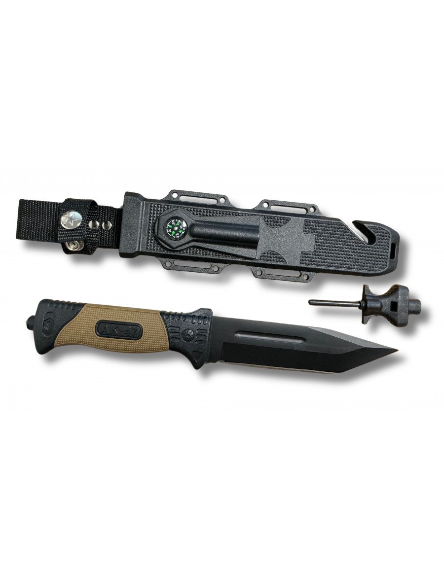 Los cuchillos de combate modernos están diseñados para resistir condiciones extremas y ofrecer máxima eficacia en situaciones tácticas. El color kaki es típico del equipamiento militar, facilitando el camuflaje y la integración en el entorno.