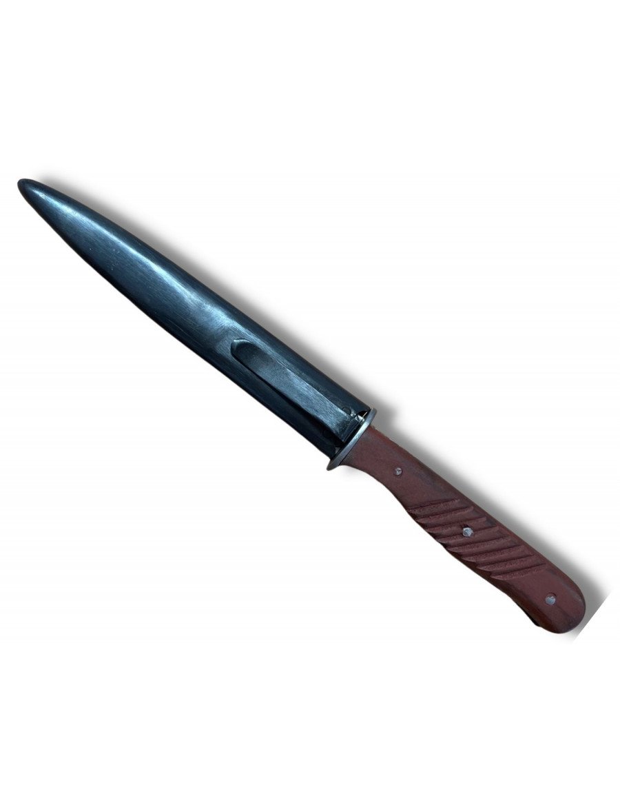 El cuchillo bota Messer 42 fue un accesorio habitual entre los soldados de la infantería alemana durante la Segunda Guerra Mundial. Su tamaño compacto permitía ocultarlo fácilmente en la bota, sirviendo tanto como arma de último recurso en combate cuerpo a cuerpo como herramienta multiusos en el campo de batalla. Fabricado con hoja de acero al carbono y empuñadura de madera, representaba la funcionalidad y la discreción. Su presencia en la equipación alemana refleja la importancia de los cuchillos auxiliares en la guerra moderna y su atractivo perdura en el coleccionismo militar.
