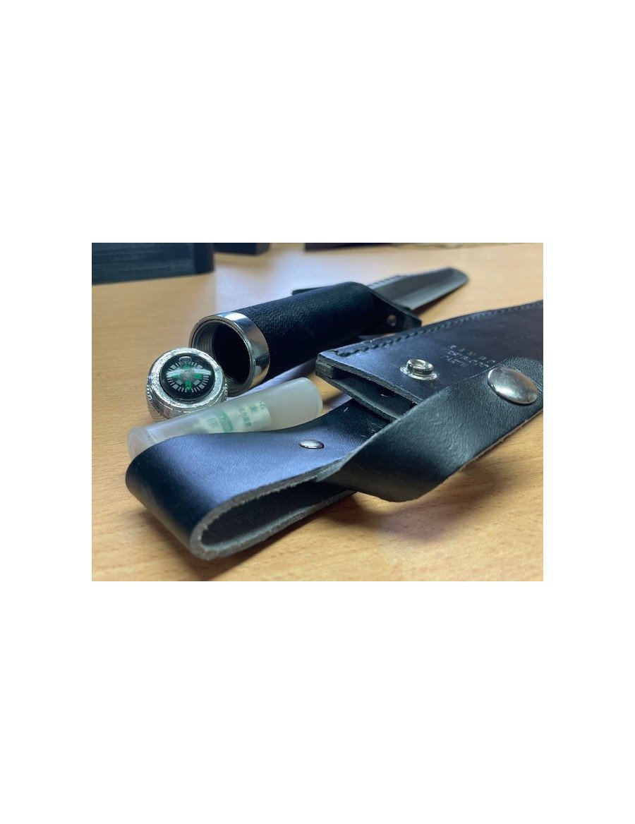 El cuchillo de supervivencia negro es un estándar en el equipo de aventura y rescate. Su funda protege la hoja y facilita el transporte seguro, siendo imprescindible en cualquier kit de supervivencia.