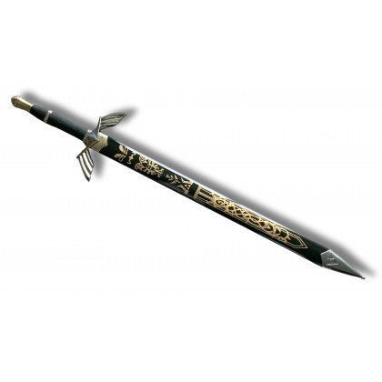 ESPADA DECORATIVA EN MADERA NEGRA Y DORADA CON VAINA GRABADA