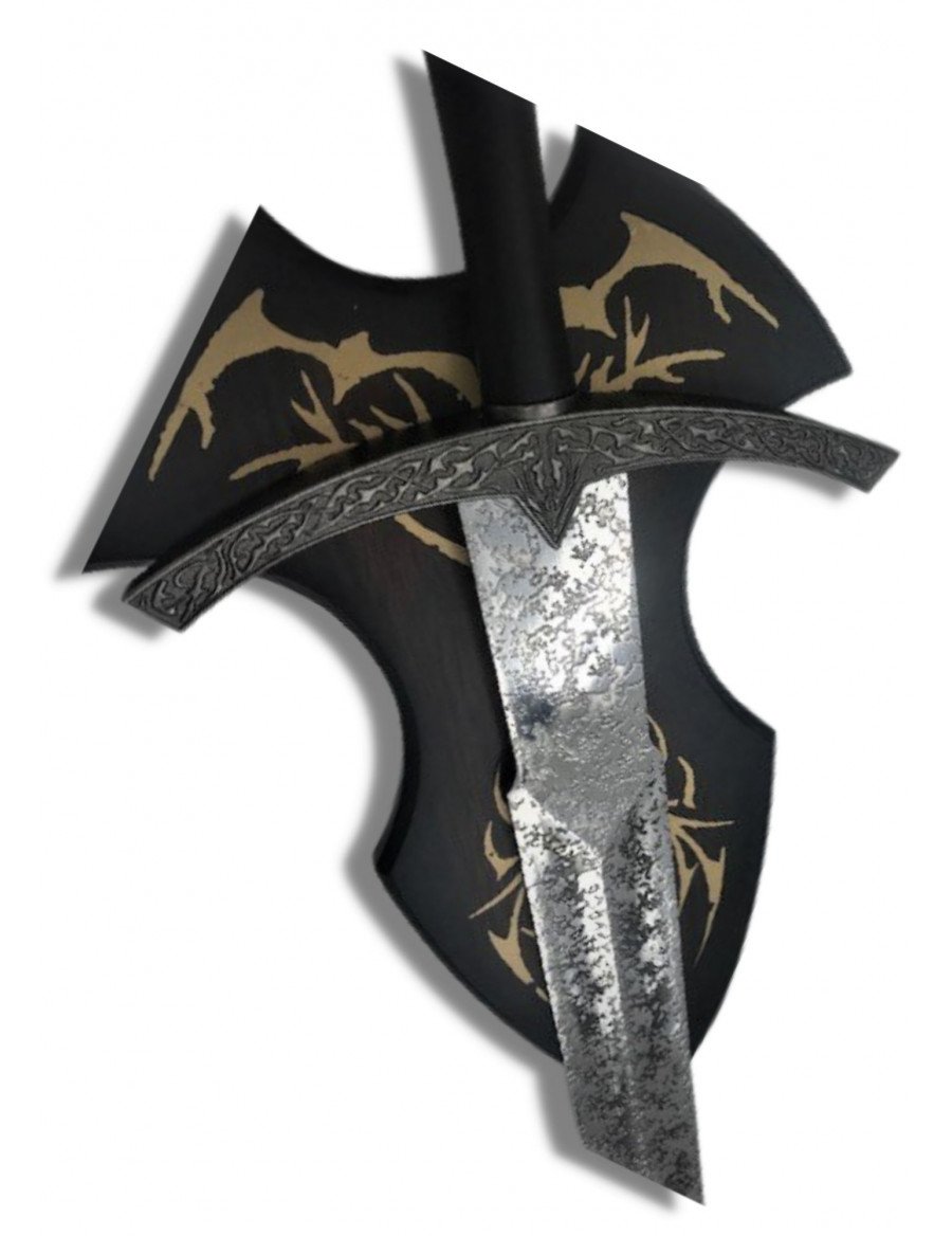 Las espadas de fantasía como esta, de gran tamaño y guarda curvada, son creaciones modernas inspiradas en el imaginario épico medieval y en universos de fantasía de cine, literatura y videojuegos. Su diseño espectacular, con detalles grabados y formas poco convencionales, busca impresionar y evocar mundos legendarios. Aunque no tienen un origen histórico concreto, estas espadas decorativas se han convertido en piezas muy apreciadas por coleccionistas y entusiastas, ya que permiten recrear la estética de héroes y villanos de la fantasía, aportando un toque único a cualquier colección o escenario temático.