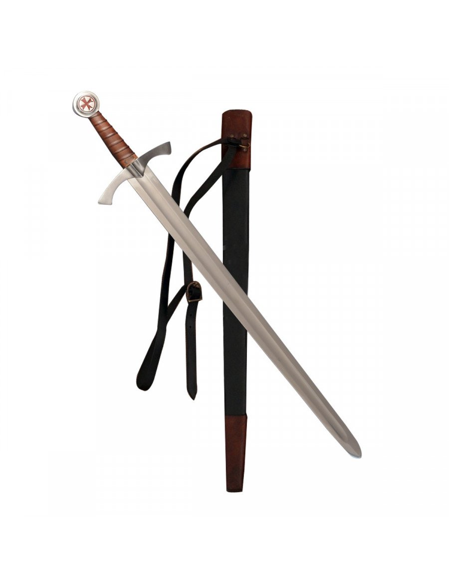 La espada templaria forjada es una fiel representación de las armas empleadas por los caballeros de la Orden del Temple durante las Cruzadas. Su hoja recta de doble filo y la cruz patada en el pomo simbolizan la fe y el compromiso de los templarios. Estas espadas eran fundamentales tanto en combate como en ceremonias, y su diseño equilibrado permitía un manejo ágil y efectivo. La empuñadura revestida de cuero ofrecía firmeza y comodidad, mientras que la funda de cuero facilitaba su transporte. Hoy, es una pieza muy apreciada por coleccionistas y amantes de la historia medieval y templaria