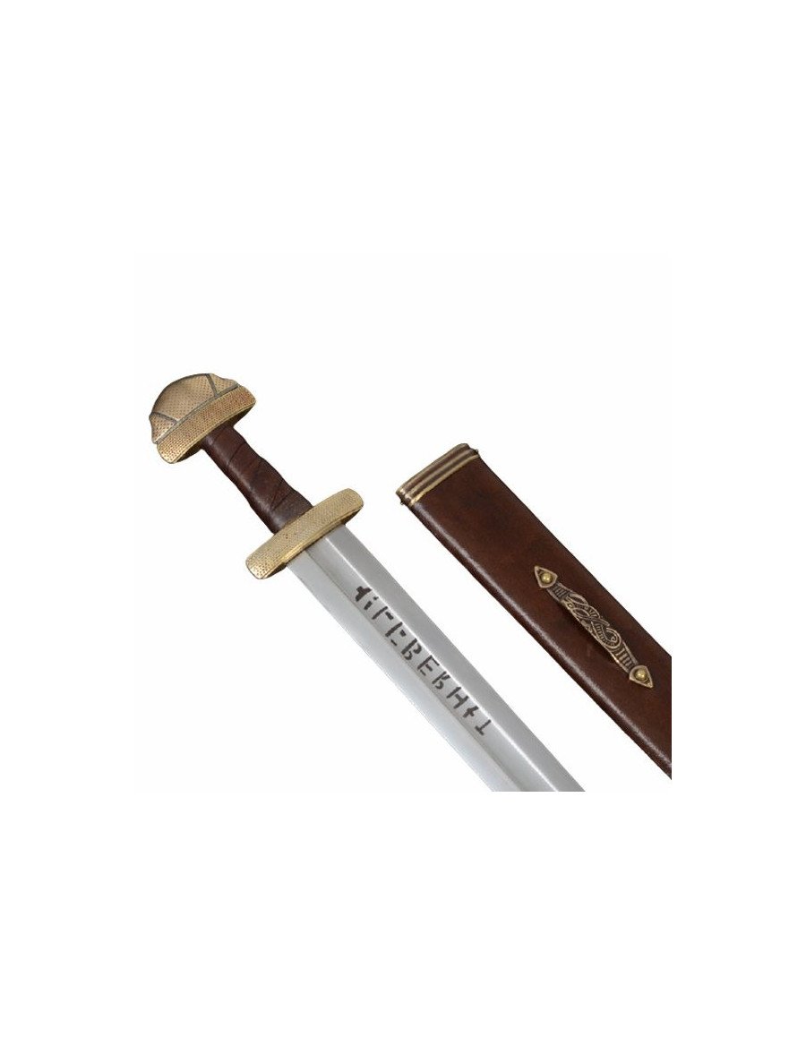 / ESPADA VIKINGA JARL CON ACABADO EN BRONCE DECORADO Y FUNDA DE CUERO