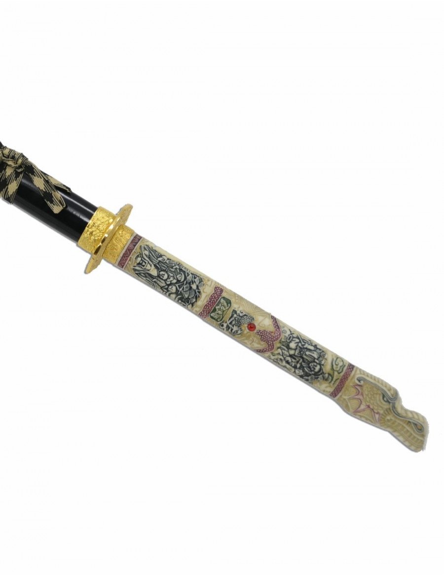 La katana con motivos de dragón es un homenaje a uno de los seres más venerados de la mitología japonesa. El dragón representa poder, sabiduría y protección, y su imagen ha sido utilizada durante siglos en armas, armaduras y arte tradicional. Esta katana decorativa fusiona la elegancia de la espada samurái con la fuerza simbólica del dragón, convirtiéndose en una pieza central para coleccionistas y amantes de la cultura oriental. Es habitual encontrar este tipo de katanas en exhibiciones temáticas y como regalo para quienes valoran la riqueza simbólica y la estética refinada del Japón clásico.