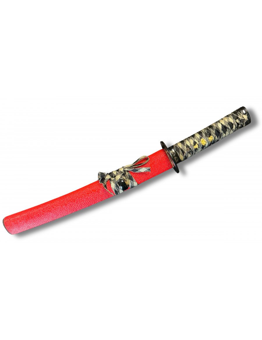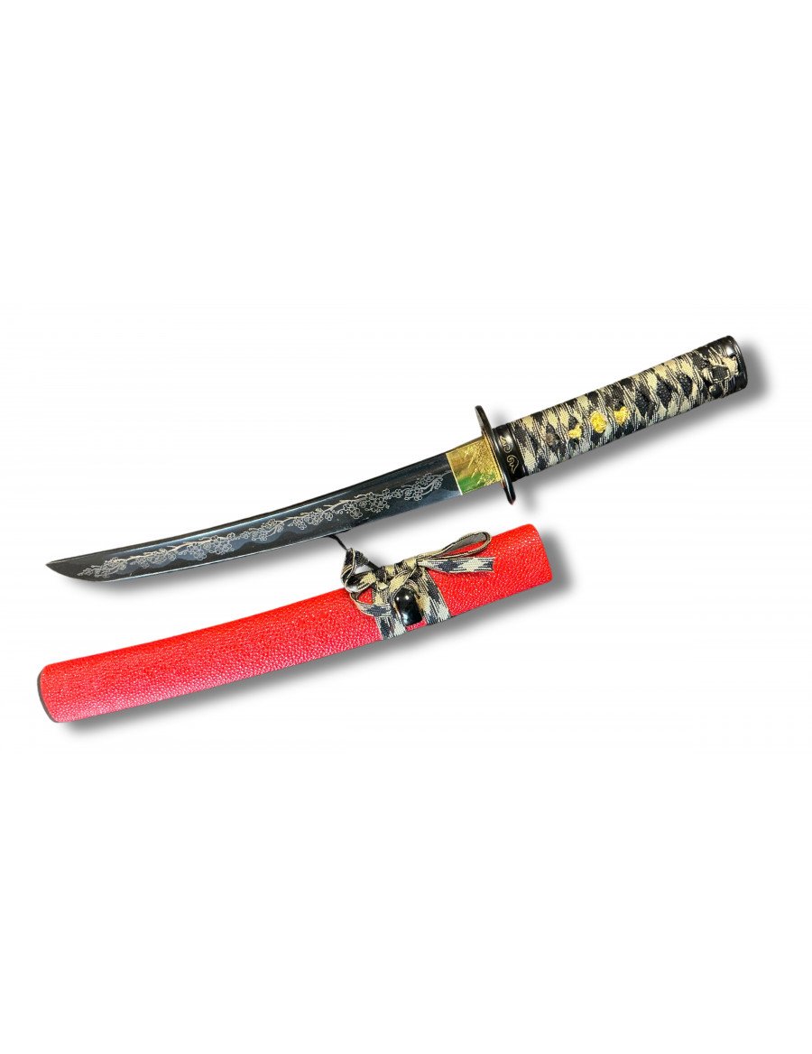 Este tanto forjado combina la tradición samurái con la delicadeza de los motivos florales, presentes en la hoja y la vaina. Las flores en la cultura japonesa representan la belleza efímera y la renovación, valores que se reflejan en la estética de esta pieza. El acero 1045 garantiza resistencia y durabilidad, mientras que el diseño artesanal la convierte en una obra de arte apreciada por coleccionistas y amantes de la cultura nipona. Es ideal para regalar o exhibir en espacios dedicados a la historia y el arte japonés.